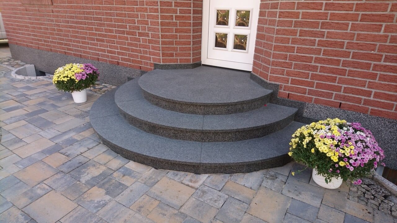 Gerade bei Außentreppen zählt Sicherheit. Geflammte oder waterjet-bearbeitete Oberflächen bieten hohe Rutschfestigkeit – bei Nässe, Frost oder Laub. Eine Übersicht der Rutschhemmungsklassen bei Natursteinbelägen finden Sie hier.