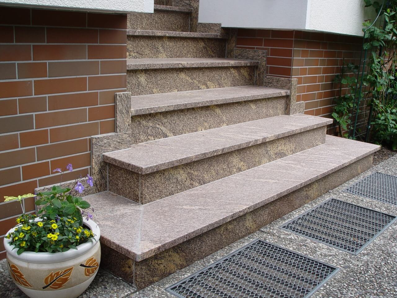 Naturstein ist wie gemacht für den Außenbereich. Geflammte oder waterjet-bearbeitete Oberflächen sorgen für hohe Rutschfestigkeit – selbst bei Nässe, Laub oder Frost. Dauerhaft schön, dauerhaft sicher.