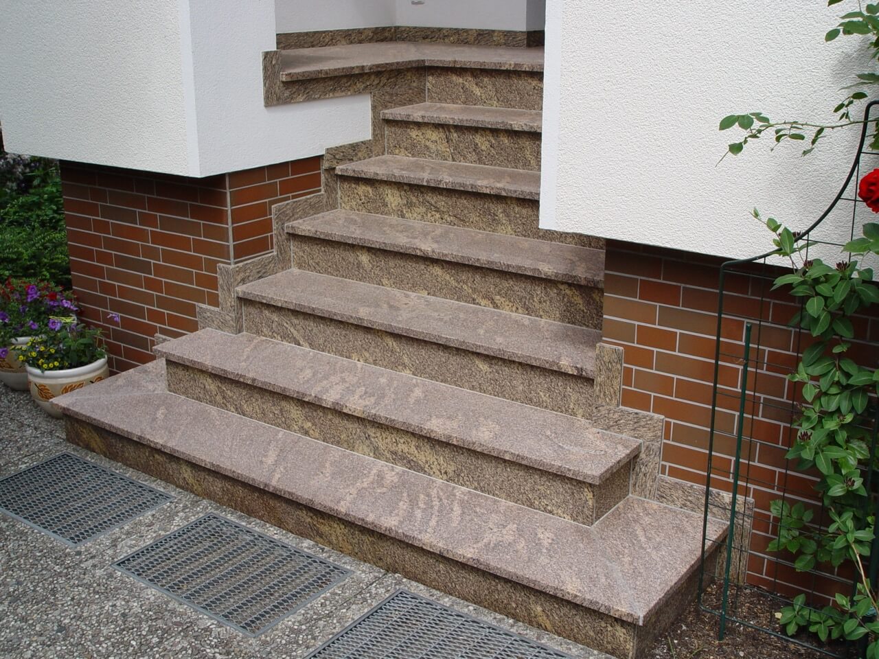 Granit, Quarzit und bestimmte Sandsteine sind besonders robust und rutschfest – ideal für Innen- und Außentreppen. Für Innenbereiche eignen sich auch edles Marmor.